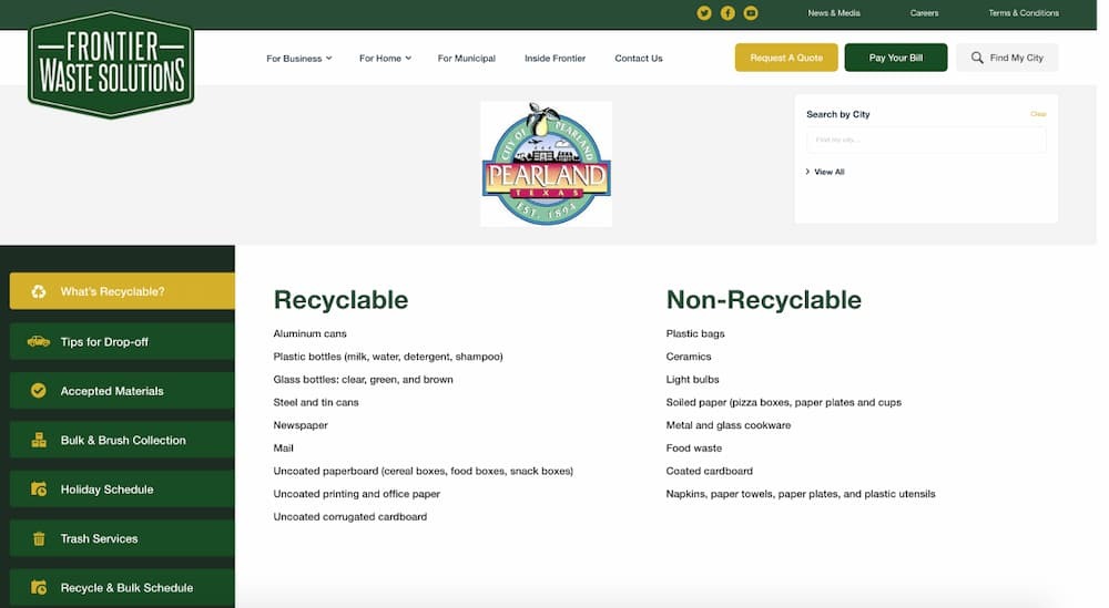 Search your city name on our website. If Frontier holds your franchise contract, you’ll find a dedicated city page showing your trash pickup schedule, recycling calendar, bulk item rules, holiday adjustments, and accepted materials list.